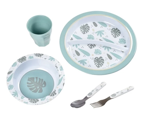 Avantages produit : base anti-dérapante sous l’assiette et le bol, formes arrondies et couverts en inox