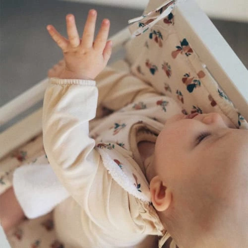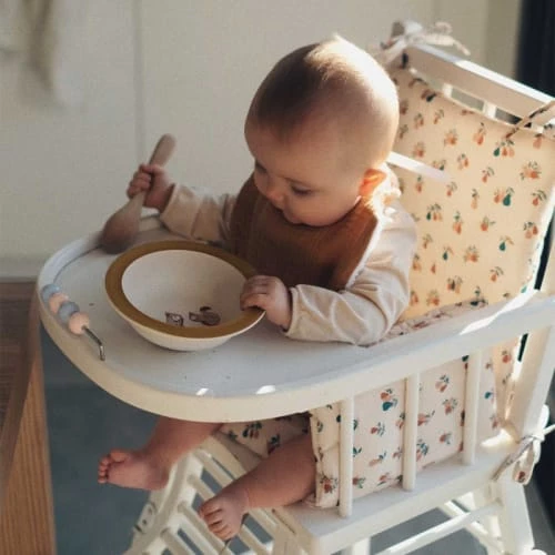 Une assise déco et moelleuse en coton bio GOTS compatible avec les chaises type Combelle. Le coussin de chaise haute peut s’utiliser avec un harnais de sécurité. Ses 4 attaches permettent de maintenir le coussin en place même lorsque bébé gigote.