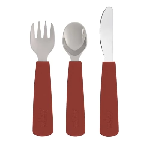 Ce set de couverts enfant en silicone et acier inoxydable est l’étape suivante dans l’apprentissage de l’alimentation lorsque les enfants apprennent à piquer et couper la nourriture.